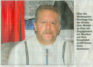 Jetzt kam der Manager der Arosa erneut auf ihn zu - und Glas versucht sein Glück. Nachmittags eine Stunde, am Abend drei Stunden soll er für die musikalische Unterhaltung der Arosa-Kreuzfahrtgäste sorgen. Spielen muss er, sagt er, was gewünscht wird. "Da muss man flexibel sein." Speziell auf diesen Job vorbereiten könne sich Glas daher auch nicht, sagt er. Aber Musik "ist mein Job", er spiele von Volkstümlichem über Schlager bis zu instrumentaler Barmusik alles, versichert er. "Da kann eigentlich nichts schiefgehen", je nach Publikum passe er seine Musik an. Glas spielt nicht nur die Musik anderer, er hat auch eigene Titel im Programm. Erst kürzlich ist eine CD von ihm erschienen.